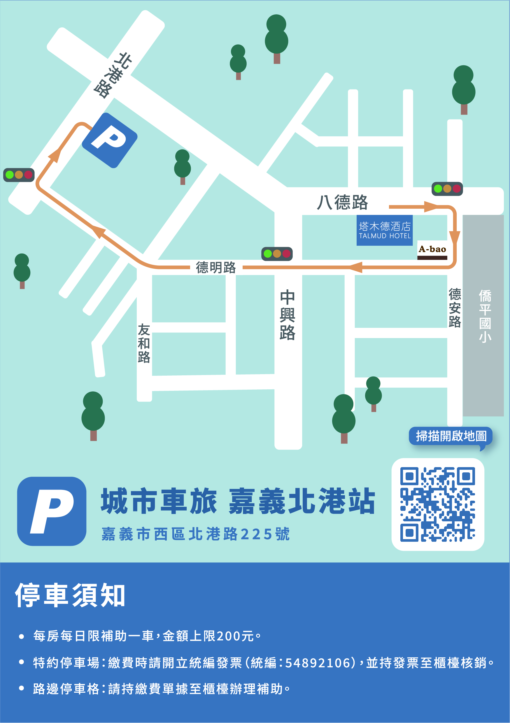| 館外停車場:路邊公有停車格、城市車旅-黃金假期嘉義北港站停車場